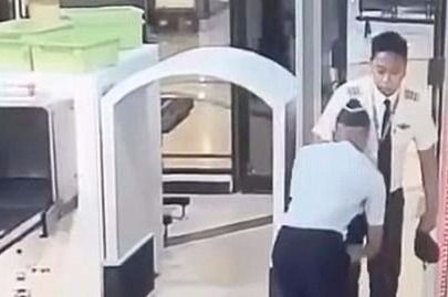 Las imágenes difundidas muestran como el capitán Tekad Purna, empleado de de Citilink, tropieza y deja caer varias veces sus pertenencias mientras atraviesa un puesto de seguridad de esas instalaciones indonesia