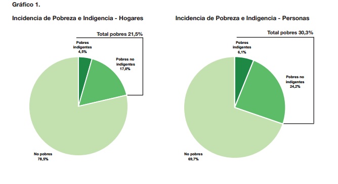 Casi un tercio de los argentinos son pobres y, de esa porción, el 6,1% es indigente. La pobreza alcanza a 21,5% de los hogares y la indigencia al 4,5%.