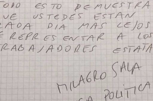 Milagro señaló a Godoy por haber intervenido la seccional jujeña del gremio y desfinanciar la organización sindical local “que hoy tiene que enfrentar los despidos de Morales”. “Todo esto demuestra que ustedes están cada día más lejos de representar a los trabajadores estatales”, concluye la carta con la firma “Milagro Sala, presa política de Macri y de Morales”.