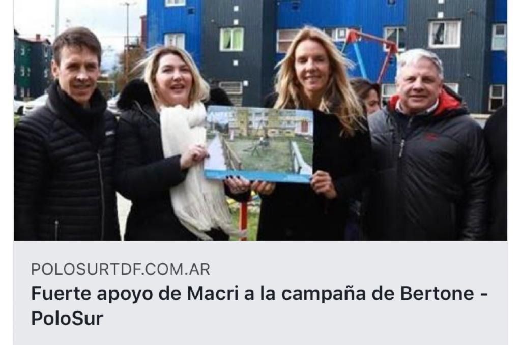 El apoyo de Macri a Bertone se volvió explícito y mutuo durante la jornada de ayer. En la presentación de un centro comunitario para Río Grande, y de mejoras en un barrio de viviendas sociales de Ushuaia, Bertone esbozó su mejor sonrisa al lado de esta histórica funcionario del PRO, que no tiene la mejor relación con el ministro del cual depende (Rogelio Frigerio), pero es la ex esposa de Iván Pavlovsky, vocero personal de Mauricio Macri. Junto a ellos estaba Héctor "Tito" Stefani, el principal referente de Cambiemos en Tierra del Fuego. Bertone volvió a vestirse de amarillo, a pesar de tener como socios electorales a los camporistas Walter Vuoto y Martín Pérez, candidatos a intendente en Ushuaia (busca reelegir) y Río Grande respectivamente.