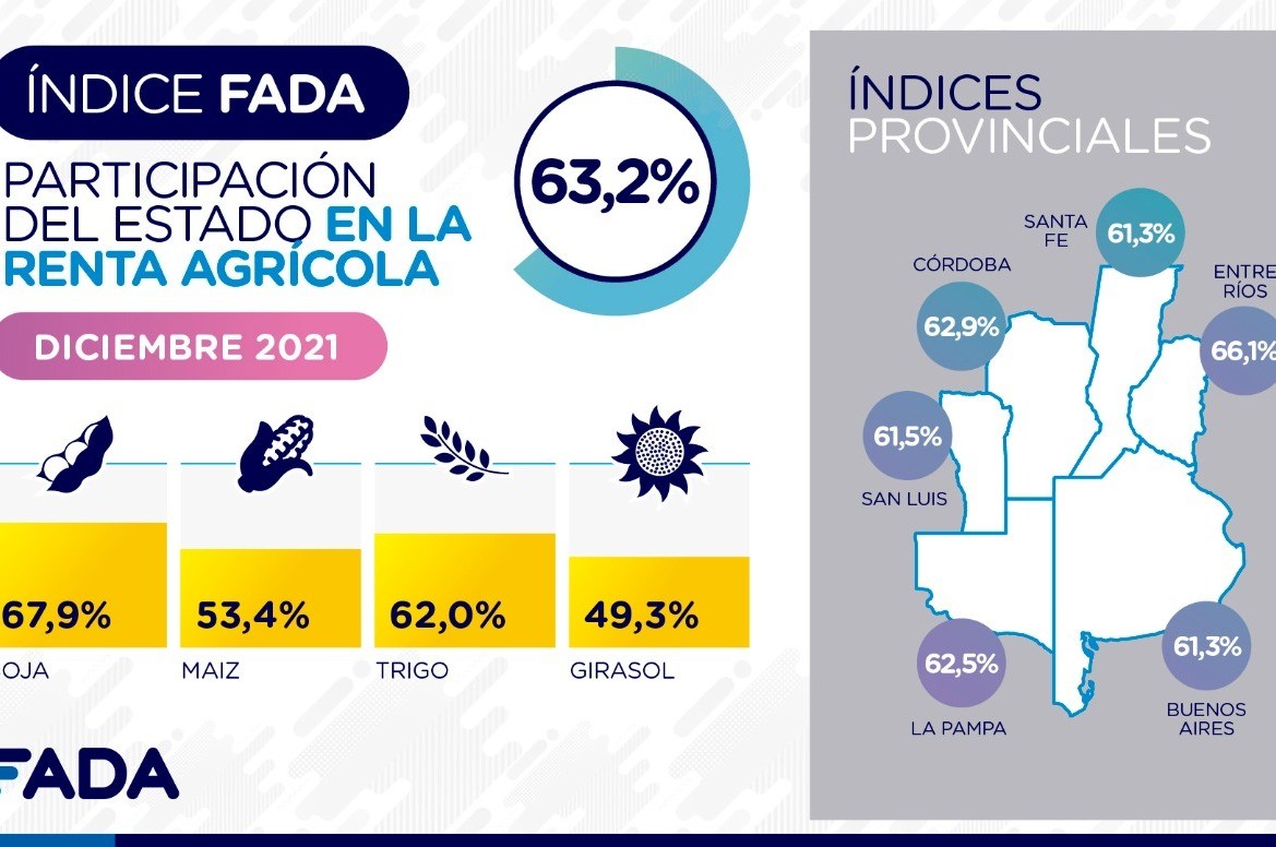 La FADA publicó su Índice trimestral que mide la participación del Estado en la renta agrícola. El informe indicó que de cada $100 que le quedan de renta al productor (ingresos menos costos), $63,20 son para los gobiernos nacional, provincial y municipal. “Este informe nos muestra que luego del esfuerzo de producir alimentos en Argentina, después de pagar todos los costos y lograr vender los granos, los impuestos se llevan el 63,2% de lo que le queda quien produce en el campo”, explica David Miazzo, economista jefe FADA.