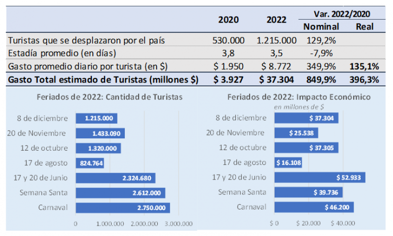 El último feriado para esta fecha había sido en 2020. Frente a ese año, que fue muy flojo por la pandemia, viajaron 130% más de turistas, y el impacto económico, medido a precios reales, se multiplicó por cinco.