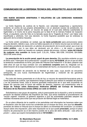 El documento también aclara que Julio De Vido fue absuelto en la causa del accidente ferroviario de Once y que la condena vigente responde a otro expediente. Según la defensa, esa causa ya debería considerarse prescripta por haber transcurrido más de seis años desde el último acto procesal relevante.