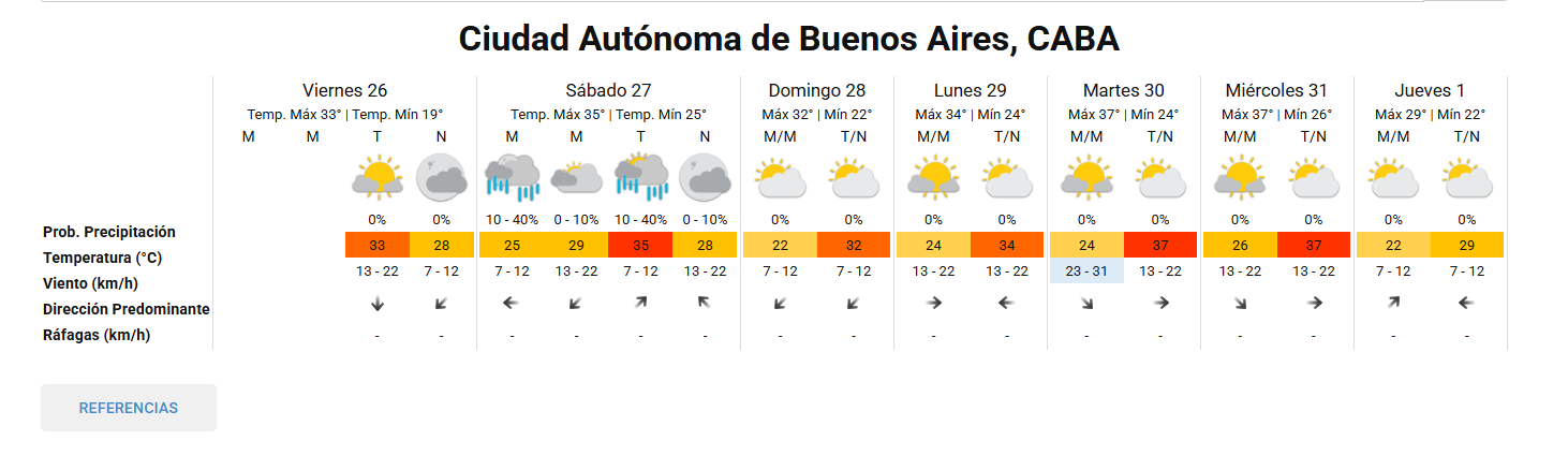 Las previsiones indican varios días consecutivos con temperaturas muy elevadas, mínimas altas y máximas que superarán ampliamente los 34 grados, en el marco de condiciones típicas de una ola de calor en el Área Metropolitana de Buenos Aires y zonas cercanas.