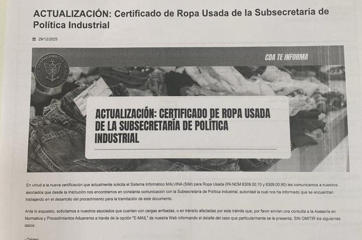 De un día para el otro, sin que esté claro a través de qué norma, la Subsecretaría de Política Industrial estableció que la “ropa usada reciclada y seleccionada” requiere una “intervención previa” para su autorización. La Asociación Civil Valores Sinaí, de iglesias evangélicas, ya tenía un contenedor en viaje, pero hasta ahora no autorizaron su nacionalización. Por ello, presentaron nota de queja ante esa subsecretaría, la Aduana y también una denuncia judicial; hasta ahora sin éxito.