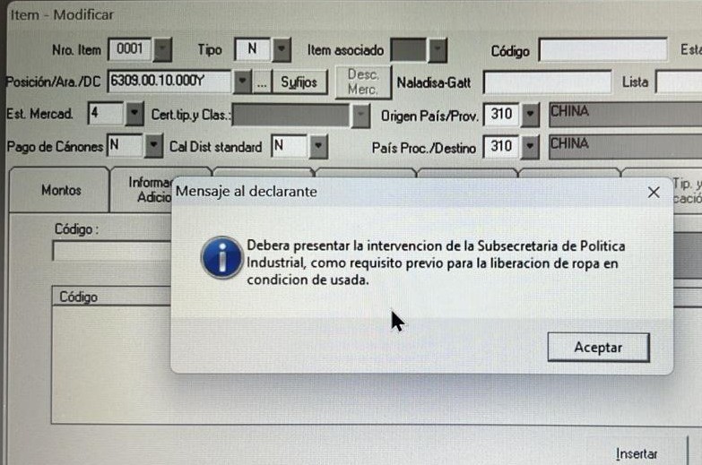 La posición arancelaria en cuestión es la 6309.00.10.000Y. Para la misma, la subsecretaría que depende del Ministerio de Economía, conducido por Luis “Toto” Caputo, estableció que cada importación de la ropa usada requiere una “intervención previa” del área de Política Industrial. De esta forma, lo que parecía una política destinada a incrementar la competencia y bajar los precios, en uno de los rubros más difíciles de realizar ambas cuestiones, se volvió una cuestión discrecional.