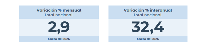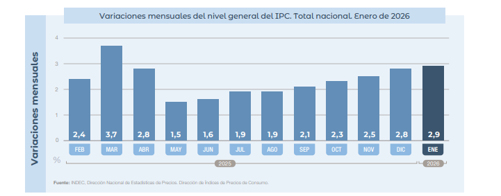 La inflación de enero de 2026 alcanzó el 2,9% y acumuló un alza del 32,4% en los últimos doce meses, según informó este martes el Instituto Nacional de Estadística y Censos (INDEC).