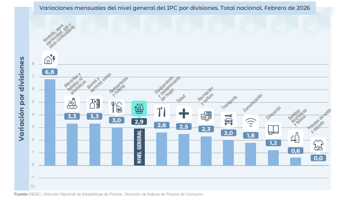 En el otro extremo, Bebidas alcohólicas y tabaco fue la división con menor aumento en febrero de 2026, con una suba de 0,6%, mientras que Prendas de vestir y calzado no registró variaciones durante el mes.